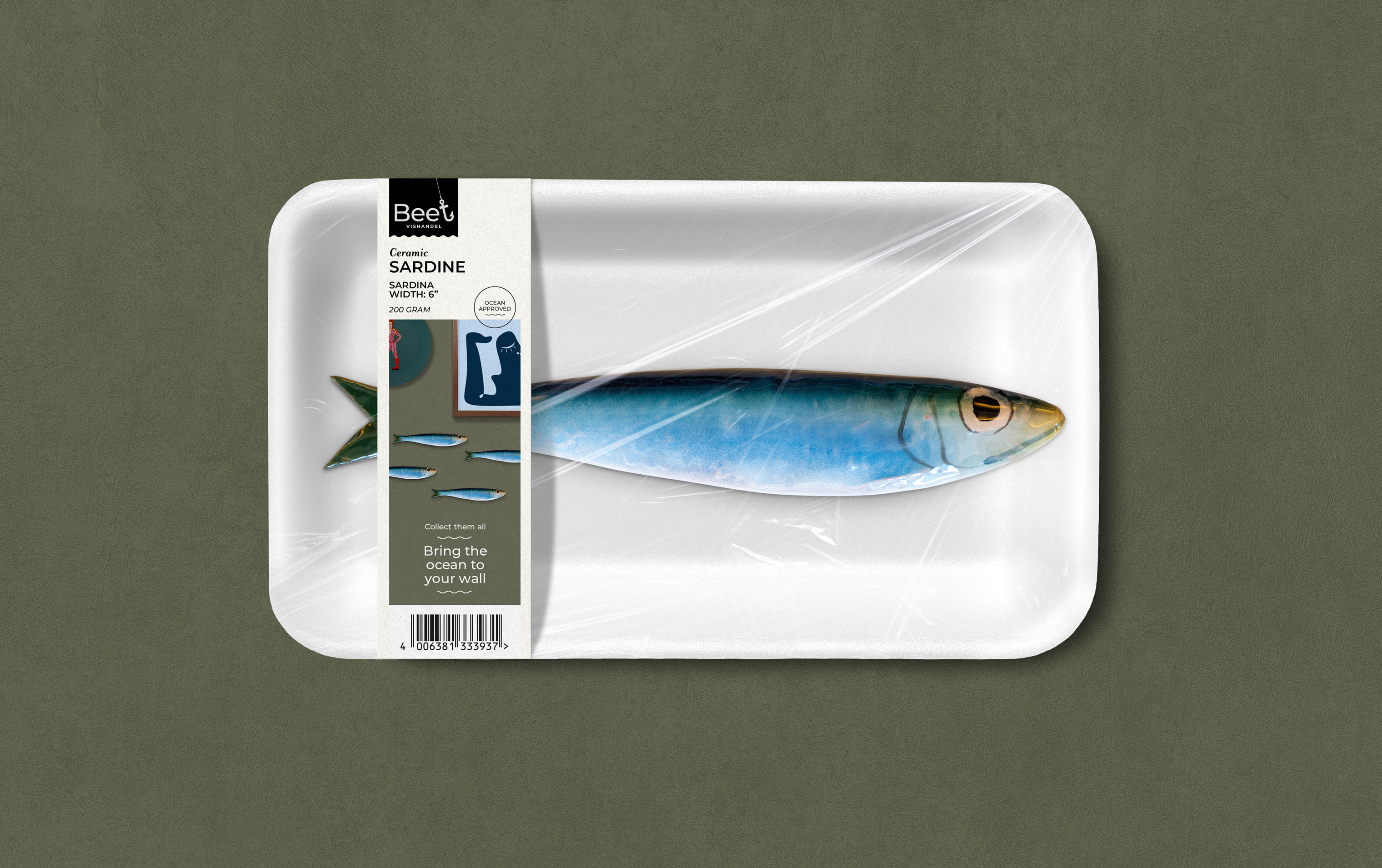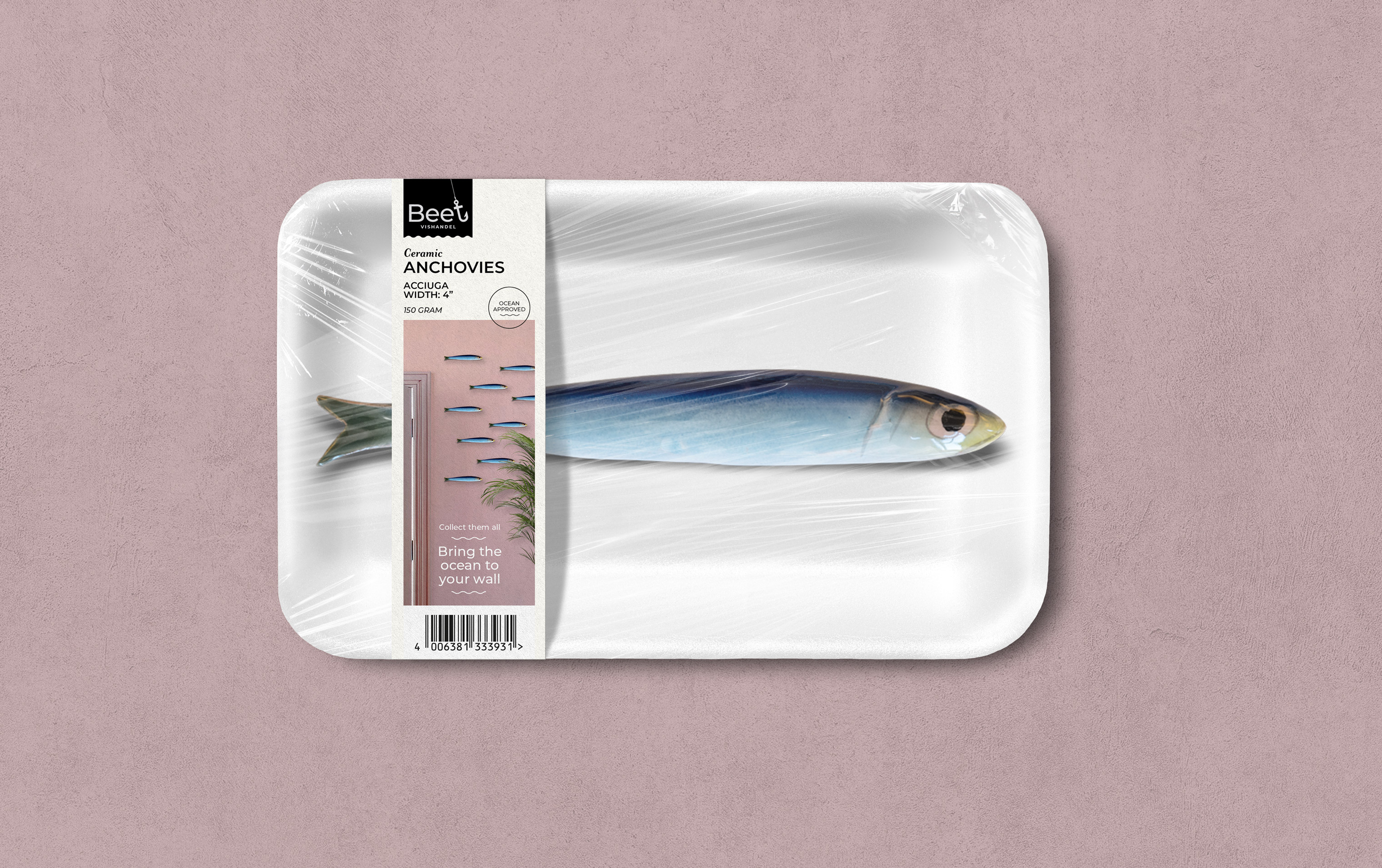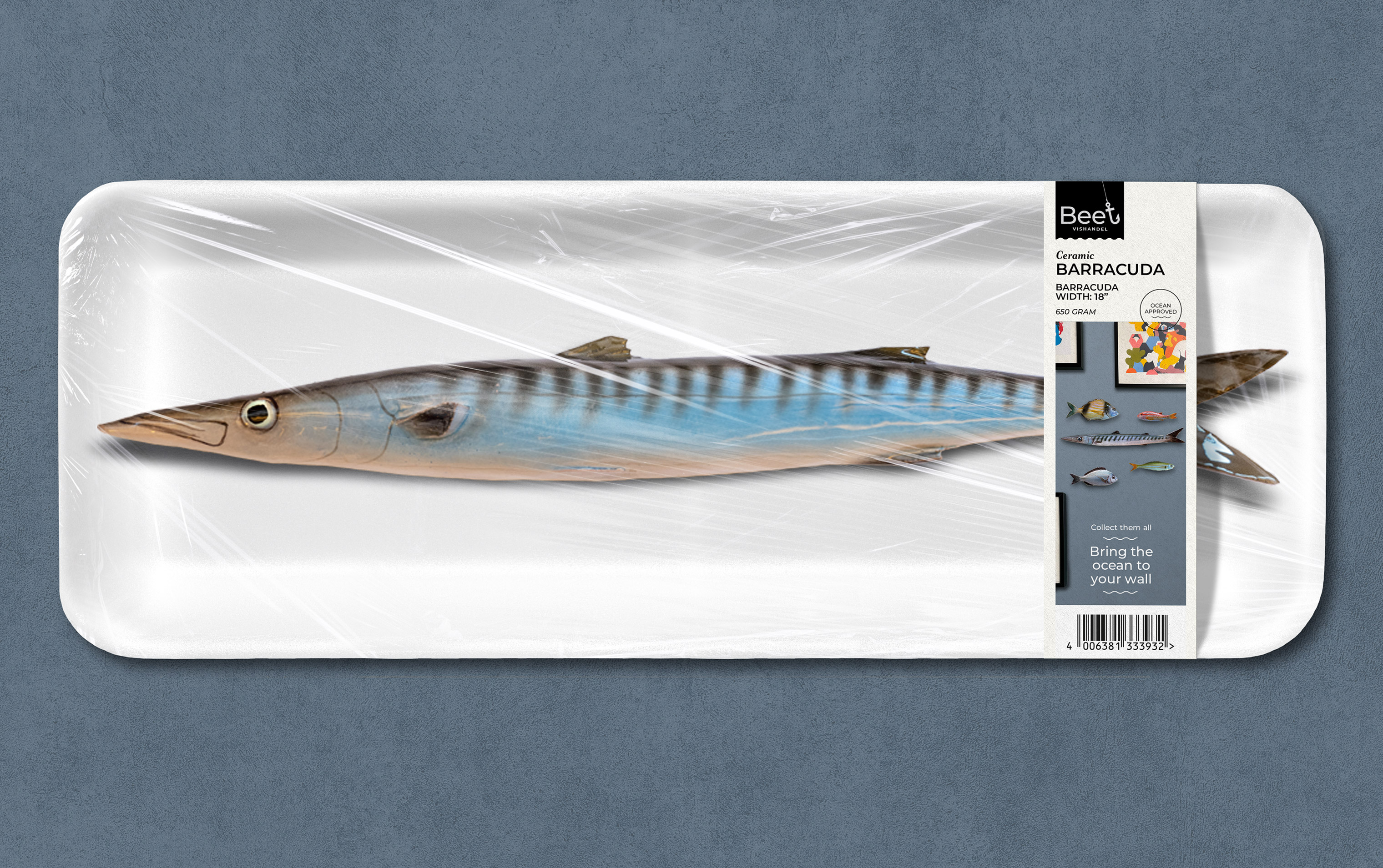 This gave us the idea to package the fish in the same way as you would find them in the refrigerated section of the supermarket. With the weight and barcode prominently displayed on the label, as you would normally see with food-related products. A striking, distinctive packaging form that you would otherwise never encounter in a home furnishings store. Typically Beet!